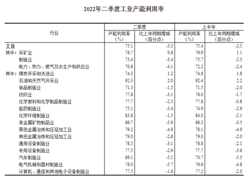 分主要行業(yè)看,二季度,煤炭開采和洗選業(yè)產(chǎn)能利用率為74.3%,食品制造業(yè)為71.3%,紡織業(yè)為77.8%,化學(xué)原料和化學(xué)制品制造業(yè)為77.7%,非金屬礦物制品業(yè)為66.7%,黑色金屬冶煉和壓延加工業(yè)為79.2%,有色金屬冶煉和壓延加工業(yè)為79.0%,通用設(shè)備制造業(yè)為78.5%,專用設(shè)備制造業(yè)為77.5%,汽車制造業(yè)為69.1%,電氣機械和器材制造業(yè)為76.0%,計算機、通信和其他電子設(shè)備制造業(yè)為77.5%。