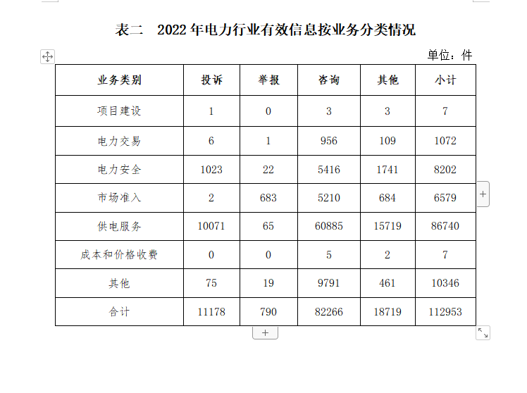 電力行業(yè)排在首位,有效信息數(shù)量為112953件,占全部有效信息的68.82%。群眾關注的內(nèi)容主要集中在供電服務、電力安全、市場準入等方面。(2022年電力行業(yè)有效信息按業(yè)務分類情況見表二)