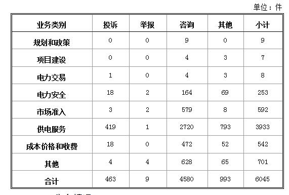 投訴舉報(bào)主要集中在電力行業(yè),共472件。從業(yè)務(wù)分類情況看,電力交易方面1件,占0.21%;電力安全方面20件,占4.24%;市場準(zhǔn)入方面5件,占1.06%;供電服務(wù)方面420件,占88.98%;成本價(jià)格和收費(fèi)方面18件,占3.81%;其他方面8件,占1.69%。(2018年1月電力行業(yè)有效信息按業(yè)務(wù)分類情況見表二)