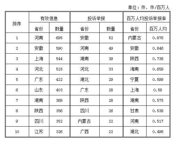 2018年1月,各?。ㄗ灾螀^(qū)、直轄市)按照有效信息數(shù)量排序,河南、安徽、上海等?。ㄊ校┝腥珖?0位;按照投訴舉報(bào)數(shù)量排序,安徽、河南、湖南等省排在全國前10位;按照百萬人均投訴舉報(bào)率排序,內(nèi)蒙古、安徽、陜西等?。ㄗ灾螀^(qū))位于全國前10位。(2018年1月有效信息及投訴舉報(bào)排名前10位情況見表三)