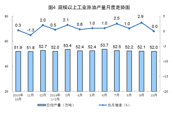 10月份,原油生產1611萬噸,產量與去年同期基本持平;日均產量52.0萬噸,環(huán)比減少0.1萬噸。1—10月份,原油生產15925萬噸,同比增長1.1%。