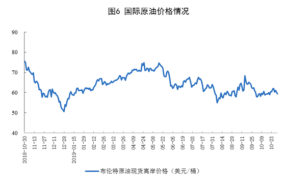 10月份,國際原油價格震蕩下跌,10月31日布倫特原油現貨離岸價格為59.3美元/桶,比9月30日下降1.69美元。