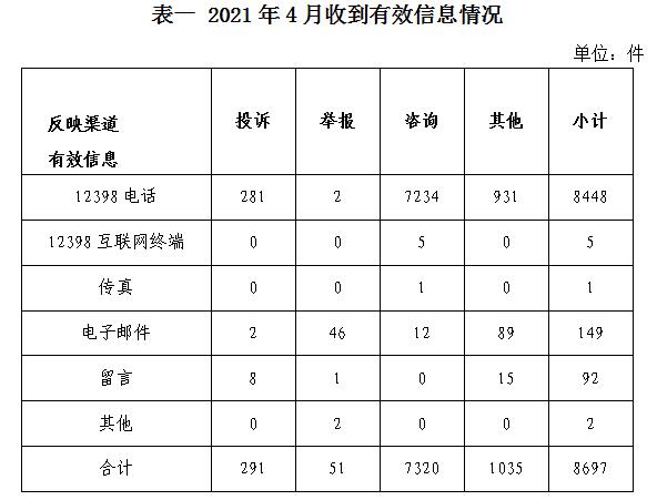 2021年4月,國家能源局12398能源監(jiān)管熱線(以下簡稱12398熱線)共收到有效信息8697件(包含投訴、舉報、咨詢和其他訴求類別),環(huán)比增加3.13%,同比減少1.43%。(2021年4月收到有效信息情況見表一)
