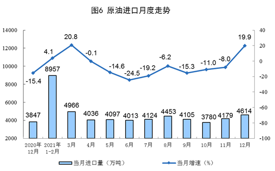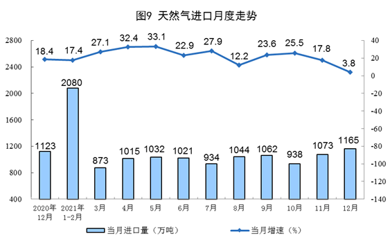 天然氣進(jìn)口增速回落。12月份,進(jìn)口天然氣1165萬噸,同比增長3.8%,增速比上月回落14.0個百分點(diǎn)。2021年,進(jìn)口天然氣12136萬噸,比上年增長19.9%。