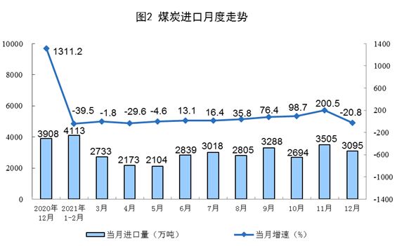 原煤生產(chǎn)繼續(xù)加快,進(jìn)口由增轉(zhuǎn)降。隨著增產(chǎn)保供政策持續(xù)推進(jìn),12月份,生產(chǎn)原煤3.8億噸,同比增長7.2%,增速比上月加快2.6個百分點(diǎn),比2019年同期增長10.7%,兩年平均增長5.2%,日均產(chǎn)量1241萬噸;進(jìn)口煤炭3095萬噸,同比下降20.8%。
