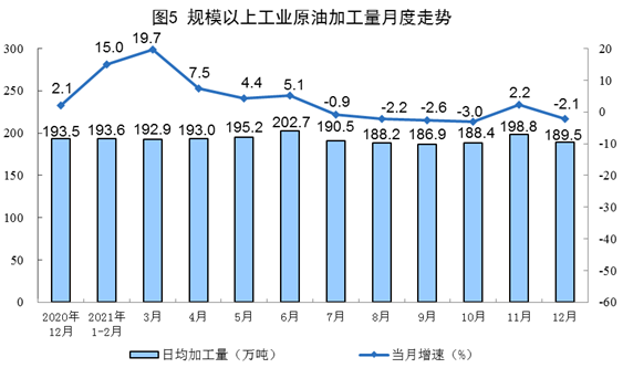原油生產(chǎn)增速略有回落,加工量由增轉(zhuǎn)降。12月份,生產(chǎn)原油1647萬噸,同比增長1.7%,增速比上月放緩1.0個百分點(diǎn),比2019年同期增長2.6%,兩年平均增長1.3%,日均產(chǎn)量53.1萬噸;加工原油5873萬噸,同比下降2.1%,上月為增長2.2%,比2019年同期下降0.1%,兩年平均下降0.1%,日均加工189.5萬噸。