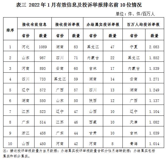 各省(自治區(qū)、直轄市)按照接收的有效信息數(shù)量排序,河北、山東、河南、四川、遼寧、湖南、江蘇、廣東、浙江、山西排在全國前10位;按照接收的投訴舉報數(shù)量排序,湖南、四川、云南、黑龍江、廣西、山東、遼寧、江蘇、廣東、河南排在全國前10位;按照辦結屬實的投訴舉報數(shù)量排序,黑龍江、內蒙古、吉林、湖南、四川、陜西、山西、西藏、甘肅、河南排在全國前10位;按照百萬人均投訴舉報數(shù)量排序,寧夏、黑龍江、內蒙古、云南、湖南、廣西、遼寧、天津、吉林、青海排在全國前10位。(2022年1月有效信息及投訴舉報排名前10位情況見表三)