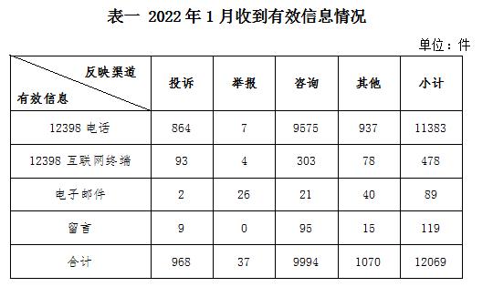 2022年1月,國家能源局12398能源監(jiān)管熱線(以下簡稱12398熱線)共收到有效信息12069件(包含投訴、舉報、咨詢和其他訴求類別),環(huán)比減少10.77%,同比減少6.45%。(2022年1月收到有效信息情況見表一)