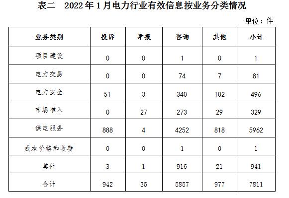 電力行業(yè)排在首位,有效信息數(shù)量為7811件,占全部有效信息的64.71%。群眾關注的內容主要集中在故障停電、供電安全、電費計量和收繳等方面。(2022年1月電力行業(yè)有效信息按業(yè)務分類情況見表二)