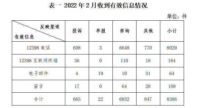 2022年2月,國家能源局12398能源監(jiān)管熱線(以下簡稱12398熱線)共收到有效信息8366件(包含投訴、舉報(bào)、咨詢和其他訴求類別),環(huán)比減少30.68%,同比增加10.27%。(2022年2月收到有效信息情況見表一)