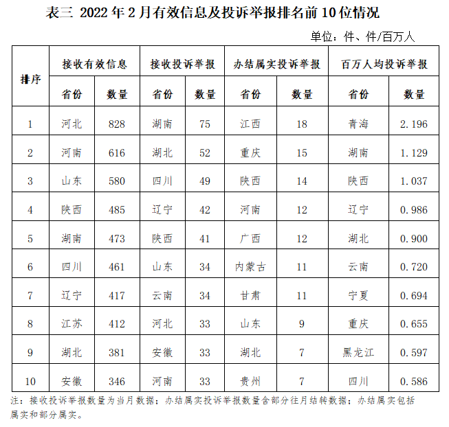 各省(自治區(qū)、直轄市)按照接收的有效信息數(shù)量排序,河北、河南、山東、陜西、湖南、四川、遼寧、江蘇、湖北、安徽排在全國前10位;按照接收的投訴舉報(bào)數(shù)量排序,湖南、湖北、四川、遼寧、陜西、山東、云南、河北、安徽、河南排在全國前10位;按照辦結(jié)屬實(shí)的投訴舉報(bào)數(shù)量排序,江西、重慶、陜西、河南、廣西、內(nèi)蒙古、甘肅、山東、湖北、貴州排在全國前10位;按照百萬人均投訴舉報(bào)數(shù)量排序,青海、湖南、陜西、遼寧、湖北、云南、寧夏、重慶、黑龍江、四川排在全國前10位。(2022年2月有效信息及投訴舉報(bào)排名前10位情況見表三)