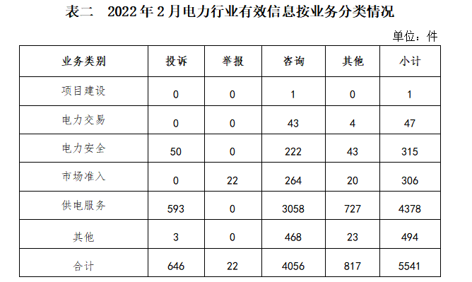 電力行業(yè)排在首位,有效信息數(shù)量為5541件,占全部有效信息的66.24%。群眾關(guān)注的內(nèi)容主要集中在供電服務(wù)、電力安全、成本價(jià)格和收費(fèi)等方面。(2022年2月電力行業(yè)有效信息按業(yè)務(wù)分類情況見表二)