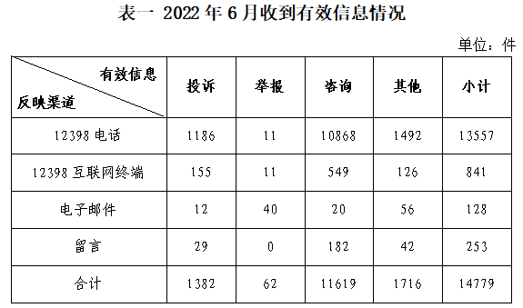 2022年6月,國家能源局12398能源監(jiān)管熱線(以下簡稱12398熱線)共收到有效信息14779件(包含投訴、舉報(bào)、咨詢和其他訴求類別),環(huán)比增加43.12%,同比增加49.28%。(2022年6月收到有效信息情況見表一)