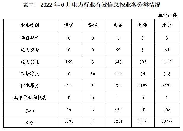 電力行業(yè)排在首位,有效信息數(shù)量為10778件,占全部有效信息的72.93%。群眾關(guān)注的內(nèi)容主要集中在供電服務(wù)、停電搶修、用戶受電工程市場(chǎng)秩序等方面。(2022年6月電力行業(yè)有效信息按業(yè)務(wù)分類情況見表二)