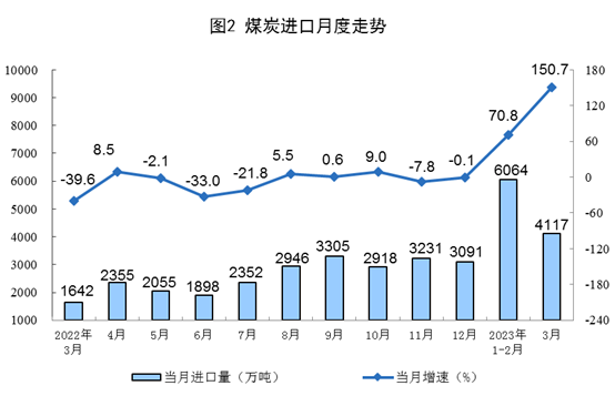 原煤生產穩(wěn)定增長,進口大幅增加。3月份,生產原煤4.2億噸,同比增長4.3%,增速比1—2月份放緩1.5個百分點,日均產量1346萬噸。進口煤炭4117萬噸,同比增長150.7%,增速比1—2月份加快79.9個百分點。