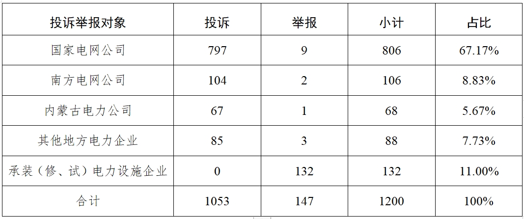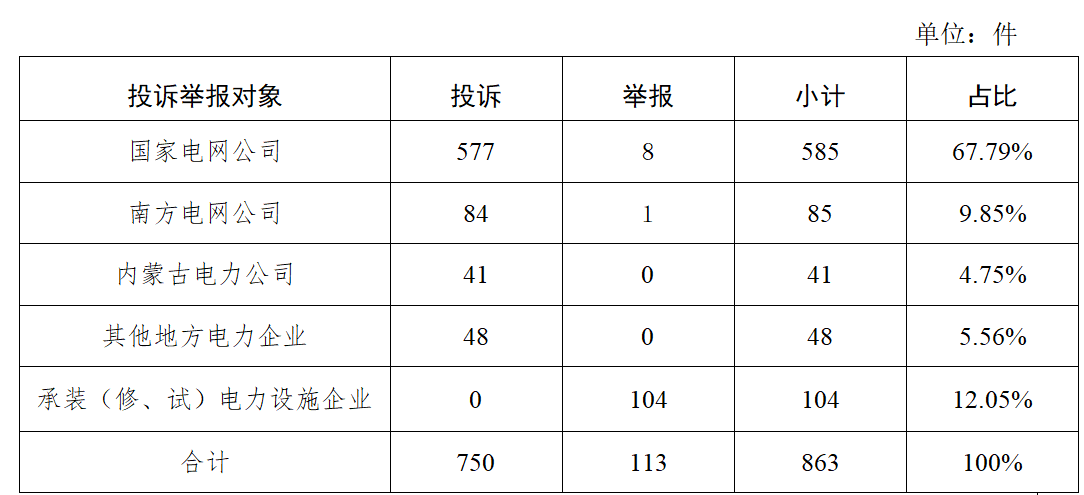 供電企業(yè)759件、占投訴舉報(bào)總數(shù)的87.95%,其中國家電網(wǎng)公司585件、占投訴舉報(bào)總數(shù)的67.79%,南方電網(wǎng)公司85件、占投訴舉報(bào)總數(shù)的9.85%,內(nèi)蒙古電力公司41件、占投訴舉報(bào)總數(shù)的4.75%,其他地方電力企業(yè)48件、占投訴舉報(bào)總數(shù)的5.56%;承裝(修、試)電力設(shè)施企業(yè)104件、占投訴舉報(bào)總數(shù)的12.05%。