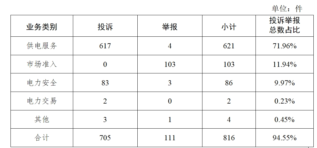 電力行業(yè)排在首位,數(shù)量為816件、占投訴舉報(bào)總數(shù)的94.55%,主要集中在供電服務(wù)、市場準(zhǔn)入、電力安全等方面。
