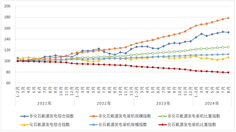 8月,非化石能源發(fā)電裝機(jī)規(guī)模指數(shù)為178.5,“十四五”以來非化石能源發(fā)電裝機(jī)規(guī)模累計(jì)增長了78.5%,同比增長22.2%。非化石能源發(fā)電裝機(jī)比重指數(shù)為125.6,“十四五”以來非化石能源發(fā)電裝機(jī)比重累計(jì)提升了25.6%(比重從2020年底的44.8%提高至2024年8月底的56.2%)。