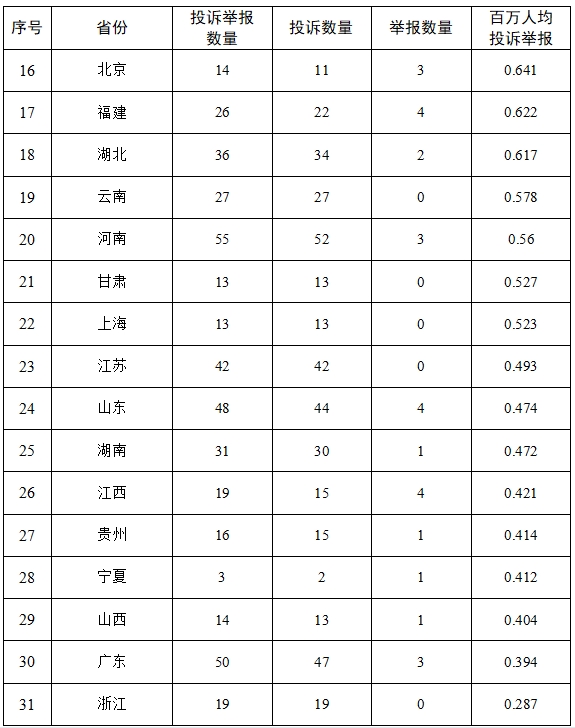 各省(自治區(qū)、直轄市)按照接收投訴舉報數(shù)量排序,四川、安徽、河南、河北、廣東排在全國前5位。按百萬人均投訴舉報數(shù)量排序,西藏、吉林、四川、天津、黑龍江排在全國前5位。(2024年8月全國接收投訴舉報地區(qū)分布情況見附件1)