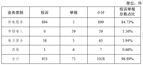 電力行業(yè)排在首位,數(shù)量為1028件、占投訴舉報總數(shù)的96.89%,主要集中在供電服務、電力安全、市場準入等方面。