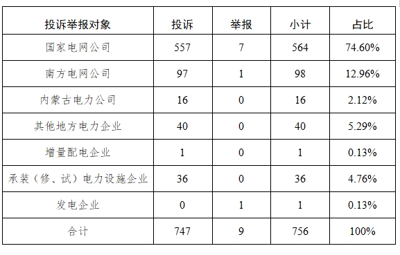 從被投訴舉報對象看,供電企業(yè)719件、占投訴舉報總數(shù)的95.11%,其中國家電網(wǎng)公司564件、占比74.60%,南方電網(wǎng)公司98件、占比12.96%,內蒙古電力公司16件、占比2.12%,其他地方電力企業(yè)40件、占比5.29%,增量配電企業(yè)1件、占比0.13%;承裝(修、試)電力設施企業(yè)36件、占比4.77%;發(fā)電企業(yè)1件、占比0.13%。