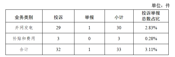 新能源和可再生能源行業(yè)排在第二位,數(shù)量為33件、占投訴舉報總數(shù)的3.11%,主要集中在并網(wǎng)發(fā)電方面。