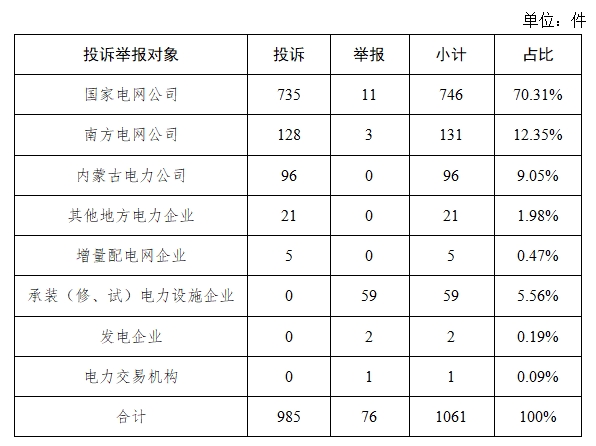 供電企業(yè)999件、占投訴舉報總數(shù)的94.16%,其中國家電網(wǎng)公司746件、占投訴舉報總數(shù)的70.31%,南方電網(wǎng)公司131件、占投訴舉報總數(shù)的12.35%,內蒙古電力公司96件、占投訴舉報總數(shù)的9.05%,其他地方電力企業(yè)21件、占投訴舉報總數(shù)的1.98%,增量配電網(wǎng)企業(yè)5件、占投訴舉報總數(shù)的0.47%;承裝(修、試)電力設施企業(yè)59件、占投訴舉報總數(shù)的5.56%;發(fā)電企業(yè)2件,占投訴舉報總數(shù)的0.19%;電力交易機構1件、占投訴舉報總數(shù)的0.09%。