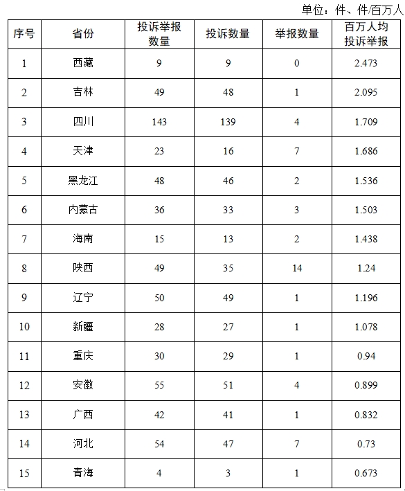 投訴舉報數(shù)量靠前的2個省份為四川(18件)、遼寧(14件)。