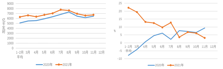1-11月份,全國工業(yè)用電量同比增長10.2%,增速同比提高8.1個百分點。全國制造業(yè)用電量同比增長10.9%,增速同比提高8.5個百分點。制造業(yè)中,四大高載能行業(yè)合計用電量同比增長7.4%,其中,建材行業(yè)同比增長8.3%,黑色行業(yè)同比增長7.7%,化工行業(yè)同比增長7.4%,有色行業(yè)用電量同比增長6.4%;高技術(shù)及裝備制造業(yè)合計用電同比增長17.0%,其中,電氣機械和器材制造業(yè)、計算機/通信和其他電子設(shè)備制造業(yè)、通用設(shè)備制造業(yè)、儀器儀表制造業(yè)、汽車制造業(yè)同比增長超過15%,分別為25.2%、21.1%、17.5%、17.1%和16.8%;消費品制造業(yè)合計用電同比增長13.6%,其中,家具制造業(yè)、紡織服裝/服飾業(yè)、文教/工美/體育和娛樂用品制造業(yè)、木材加工和木/竹/藤/棕/草制品業(yè)、皮革/毛皮/羽毛及其制品和制鞋業(yè)、紡織業(yè)同比增長超過15%,分別為19.9%、18.4%、18.1%、17.8%、17.0%和16.0%。