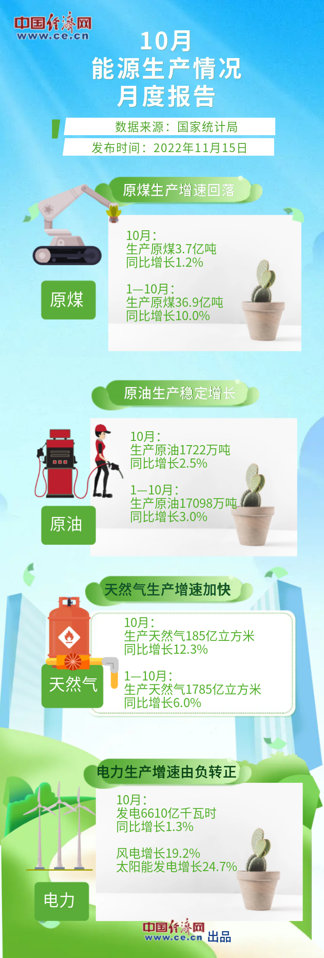 國家統(tǒng)計(jì)局發(fā)布能源生產(chǎn)情況月度報(bào)告。10月份,規(guī)模以上工業(yè)原煤、原油、天然氣和電力生產(chǎn)同比保持增長,其中,生產(chǎn)天然氣185億立方米,同比增長12.3%,太陽能發(fā)電增長24.7%。1—10月份,生產(chǎn)原煤36.9億噸,同比增長10.0%。