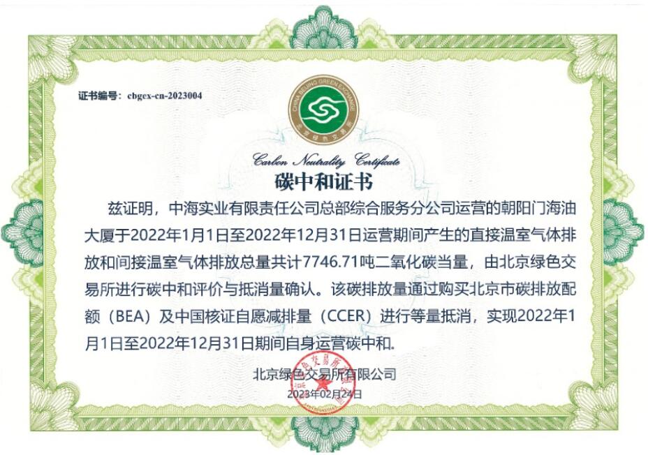 3月6日,經(jīng)北京綠色交易所有限公司認(rèn)證,中國海油總部大樓實(shí)現(xiàn)年度運(yùn)營“碳中和”。