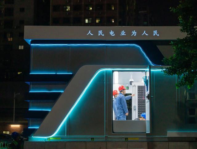華燈初上,夜色闌珊,位于寶安區(qū)新橋街道的萬豐村,一座外形酷似魔方的建筑格外引人注目。只見一個(gè)巨大的南方電網(wǎng)logo映入眼簾,散發(fā)著柔和幽靜的藍(lán)色微光。“涓涓流淌”的飄帶與logo時(shí)而匯聚、時(shí)而分散,與背后高速穿梭的地鐵11號(hào)線交相輝映。這是南方電網(wǎng)深圳供電局研發(fā)的新型全預(yù)裝近零碳景觀配電站,被稱為“電力魔方”。