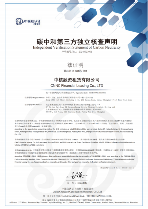 近日,中核融資租賃有限公司獲權(quán)威第三方機構(gòu)中誠信認證頒發(fā)碳中和認證,成為首家實現(xiàn)運營碳中和的融資租賃公司。