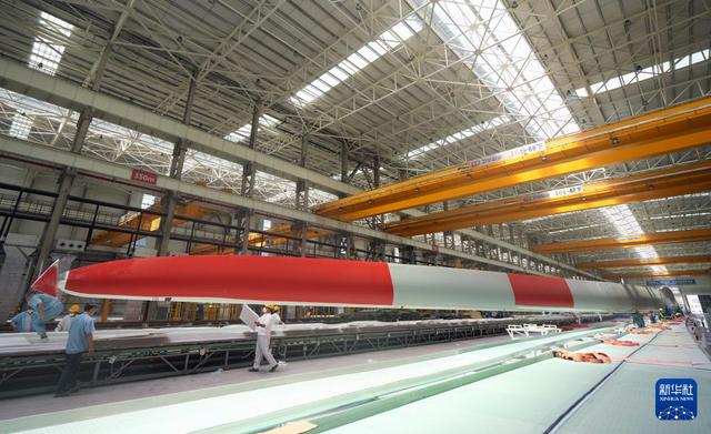 6月6日,在射陽中車風(fēng)電葉片工程有限公司生產(chǎn)車間拍攝的大型風(fēng)機葉片。新華社記者 李尕 攝