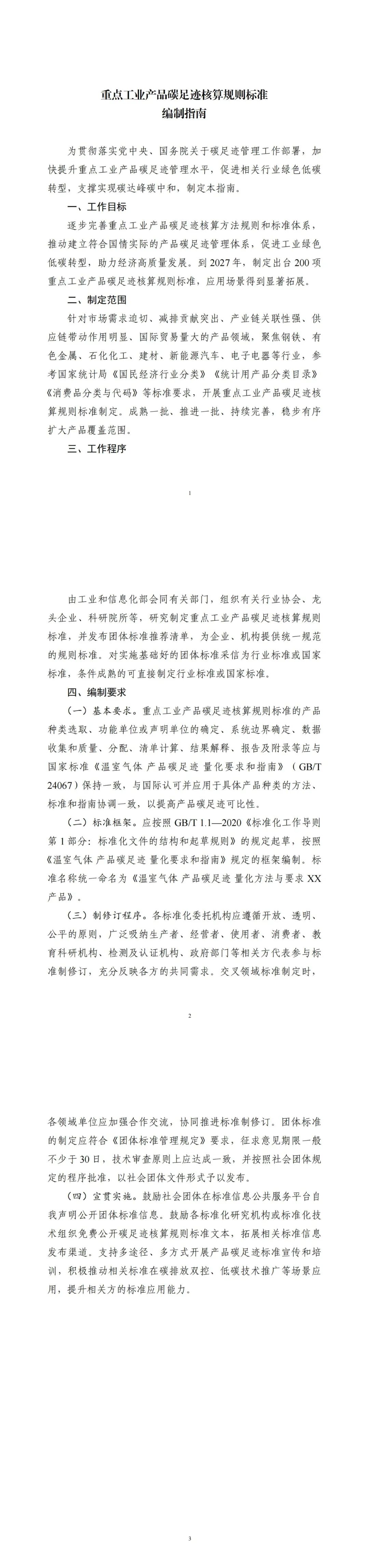 為貫徹落實黨中央、國務(wù)院關(guān)于碳足跡管理工作部署,加快提升重點工業(yè)產(chǎn)品碳足跡管理水平,促進相關(guān)行業(yè)綠色低碳轉(zhuǎn)型,支撐實現(xiàn)碳達峰碳中和,特制定《重點工業(yè)產(chǎn)品碳足跡核算規(guī)則標準編制指南》,請遵照執(zhí)行。