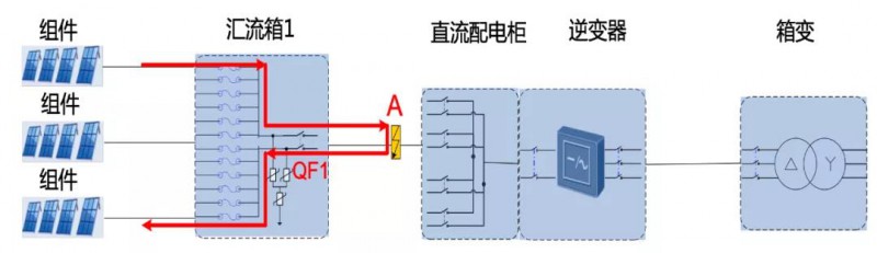 如上圖的A點發生短路故障,紅色故障回路:QF1為匯流箱斷路器,額定電流500A,由于組件的短路電流在480A左右,QF1一直不會脫扣,持續輸出直流能量到故障點,維持電弧燃燒,擴大火災事故。