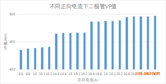 按照實(shí)測(cè)的兩個(gè)芯片VF值相差3mV來考量的話,將正向電流區(qū)間縮小再次測(cè)試,得到下圖數(shù)據(jù)。可以推測(cè),如果雙芯片二極管兩個(gè)芯片間VF相差3mV,則2個(gè)芯片間分流相差不超過0.2A。實(shí)際上,在二極管結(jié)溫測(cè)試以及光伏組件戶外使用時(shí),0.2A的電流也是完全在誤差波動(dòng)范圍內(nèi)。
