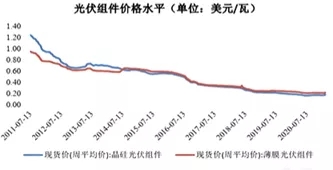 從光伏發(fā)電的成本看,光伏組件和配件價(jià)格都在逐漸下降。2008年,我國(guó)光伏組件平均成本為25元,2019年這一成本降至了2元。