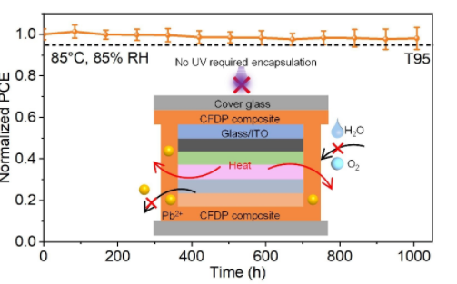利用氟硅聚合物凝膠封裝的鈣鈦礦電池在高溫、高濕度(85℃、85%相對濕度)下運行1000小時,器件效率保持初始效率的98%,表現出了優(yōu)異的濕熱穩(wěn)定性。(西北工業(yè)大學材料學院納米能源中心供圖)