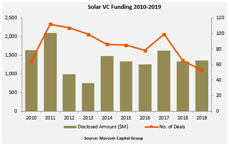 2019年太陽能行業(yè)的全球風險投資和私募股權融資(VC / PE)共計53筆交易,達到14億美元,而2018年的65筆交易為13億美元。
