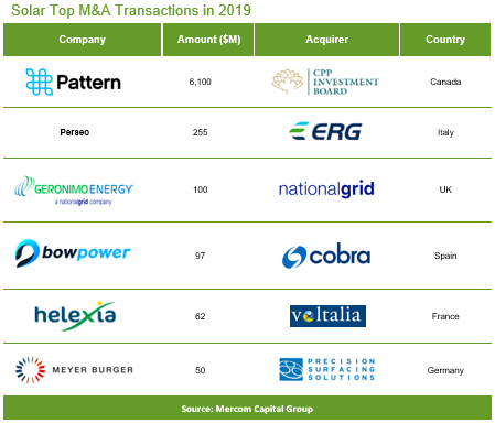 2019年,太陽能領域有65項并購交易,而2018年為82宗。大多數(shù)交易涉及太陽能下游企業(yè)。2019年,BayWa,EDF可再生能源和Engie均收購了兩家公司。 2019年最大的一筆交易是加拿大退休金計劃投資委員會(CPPIB)以61億美元收購Pattern Energy的交易。