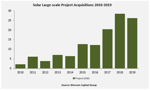 2019年,共有26吉瓦的大型太陽能項目易手,而2018年為29吉瓦。2019年有192個大型太陽能項目并購,而2018年為218個大型太陽能項目。