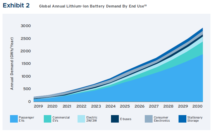 根據(jù)RMI公司的研究和彭博新能源財(cái)經(jīng)公司的分析,到2030年,全球?qū)︿囯x子電池的需求預(yù)計(jì)將達(dá)到每年2.8TW。其中大部分將滿足電動汽車需求。