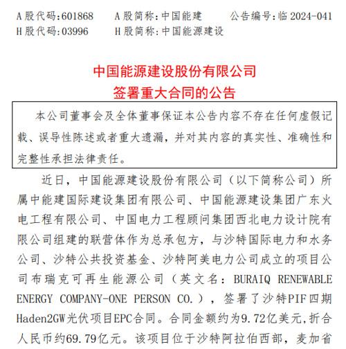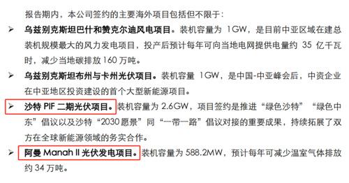 中國能建2023年度社會責(zé)任(ESG)報(bào)告顯示,報(bào)告期內(nèi),公司簽訂的海外項(xiàng)目包含:沙特PIF二期光伏項(xiàng)目、阿曼Manah II光伏發(fā)電項(xiàng)目。