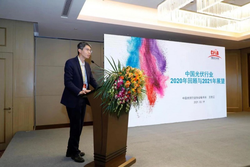 論壇上,中國光伏行業協會王世江秘書長做了題為《2020年中國光伏行業回顧和2021年中國光伏行業展望》的主題演講。王秘書長指出,2020年,國內光伏電站裝機規模持續提升,投資成本繼續下降,產業集中度快速提升,技術不斷發展,融資規模不斷擴大,國際化布局不斷加強;展望2021年,全球光伏市場規模將加速擴大,源網荷儲一體化和多能互補大基地將成為電站開發關注熱點,技術快速迭代,行業將迎來擴產潮,“光伏+”模式帶來更多應用可能性,預計光伏將占據可再生能源增量市場半壁江山。