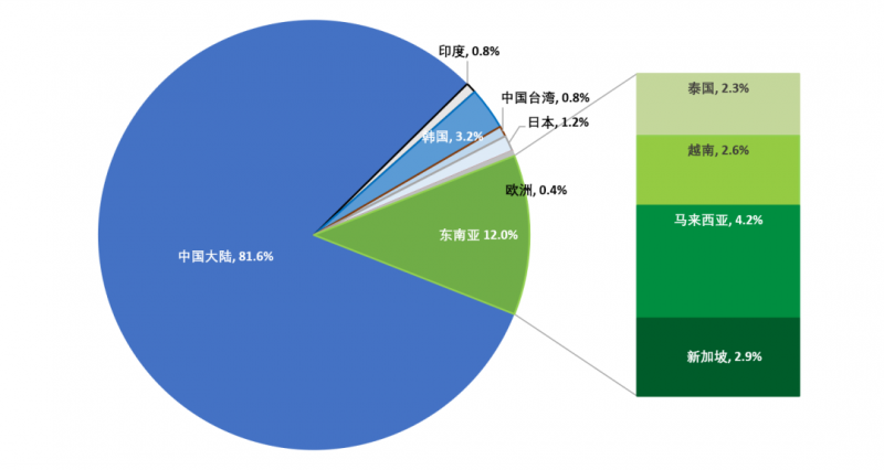 2021年2月,中國大陸市場的太陽能電池片產量占比穩定,仍然保持在80%以上