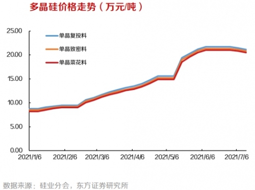 或許是在大擴(kuò)產(chǎn)的預(yù)期下,近期硅料普遍價(jià)格由大漲轉(zhuǎn)向松動(dòng)。根據(jù)硅業(yè)分會(huì)數(shù)據(jù),上周國(guó)內(nèi)單晶復(fù)投料成交均價(jià)下滑至 20.81 萬(wàn)元/噸,周環(huán)比降幅為 1.61%;單晶致密料成交均價(jià)下滑至 20.6 萬(wàn)元/噸,周環(huán)比降幅為 1.06%;單晶菜花料成交均價(jià)下滑至 20.35 萬(wàn)元/噸,周環(huán)比降幅 0.73%。