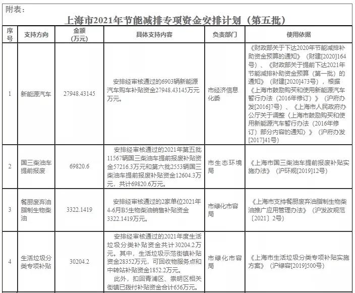 1、按照《財政部關(guān)于下達2020年節(jié)能減排補助資金預(yù)算的通知》(財建[2020]164號)、《財政部關(guān)于提前下達2021年節(jié)能減排補助資金預(yù)算(第一批)的通知》(財建[2020]473號),根據(jù)《上海市鼓勵購買和使用新能源汽車暫行辦法(2016年修訂)》(滬府辦發(fā)[2016]7號)、《上海市人民政府辦公廳關(guān)于調(diào)整〈上海市鼓勵購買和使用新能源汽車暫行辦法(2016年修訂)部分內(nèi)容的通知〉》(滬府辦發(fā)[2017]41號)等規(guī)定,安排經(jīng)審核通過的6903輛新能源汽車購車補貼資金27948.43145萬元。