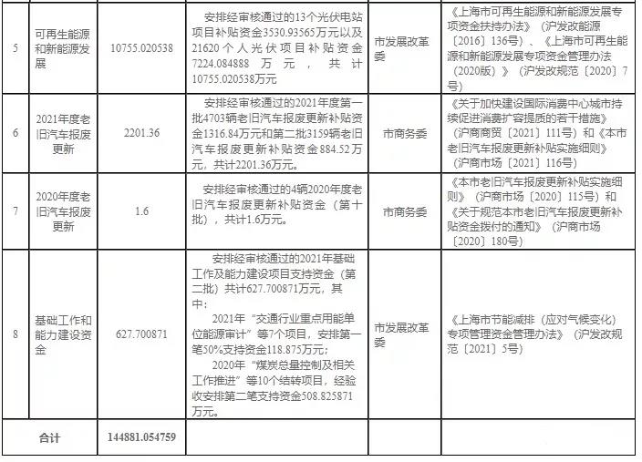 5、按照《上海市可再生能源和新能源發(fā)展專項資金扶持辦法》(滬發(fā)改能源〔2016〕136號)、《上海市可再生能源和新能源發(fā)展專項資金管理辦法(2020版)》(滬發(fā)改規(guī)范〔2020〕7號)等相關(guān)規(guī)定,安排經(jīng)審核通過的13個光伏電站項目以及21620個人光伏項目補貼資金,共計10755.020538萬元。