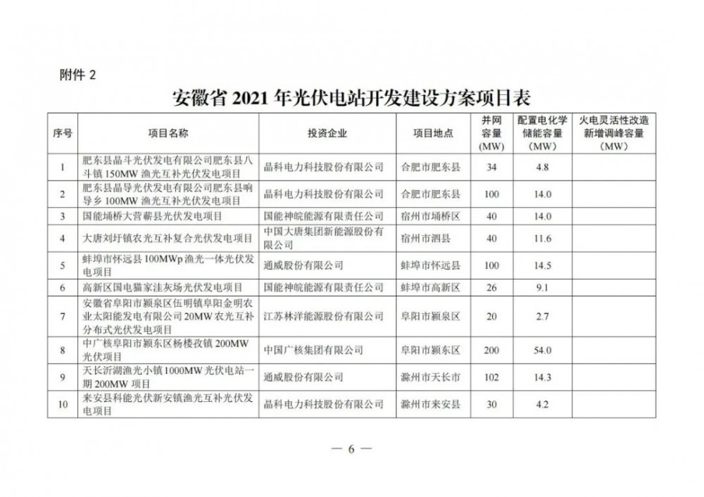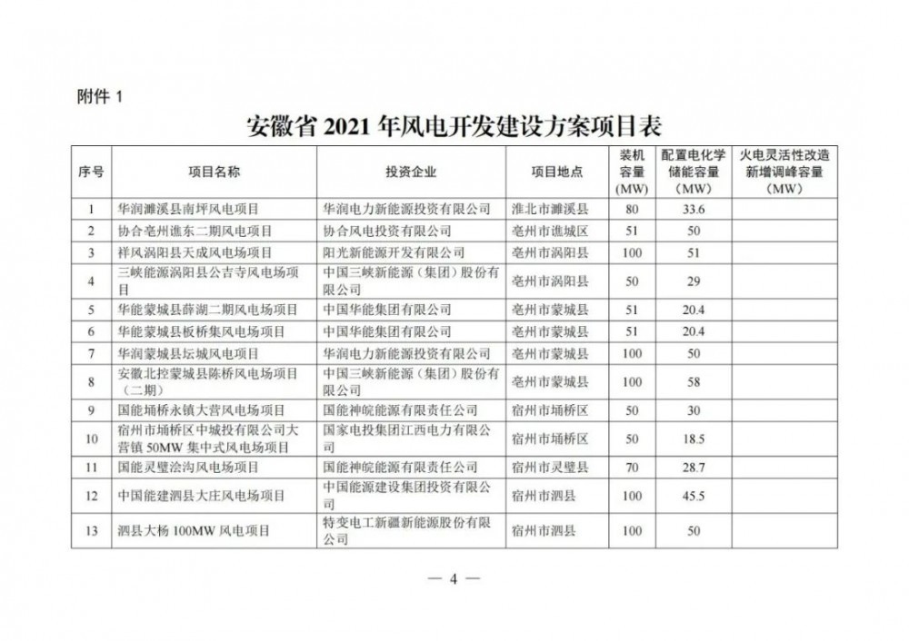 12月6日,安徽省能源局關(guān)于印發(fā)2021年風(fēng)電、光伏發(fā)電開發(fā)建設(shè)方案的通知。其中,光伏并網(wǎng)容量4574MW,要求配置電化學(xué)儲(chǔ)能容量961.5 MW,火電靈活性改造新增調(diào)峰容量619.6MW。風(fēng)電裝機(jī)容量1426MW,要求配置電化學(xué)儲(chǔ)能容量600.4 MW,火電靈活性改造新增調(diào)峰容量349.7MW。且規(guī)定電化學(xué)儲(chǔ)能電站連續(xù)儲(chǔ)能時(shí)長(zhǎng)為1小時(shí)。